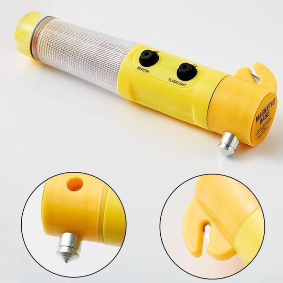 - 5 em 1: Lanterna de LED, luzes de sinalização vermelhas, faca para cinto de segurança, martelo de segurança, imã poderoso
