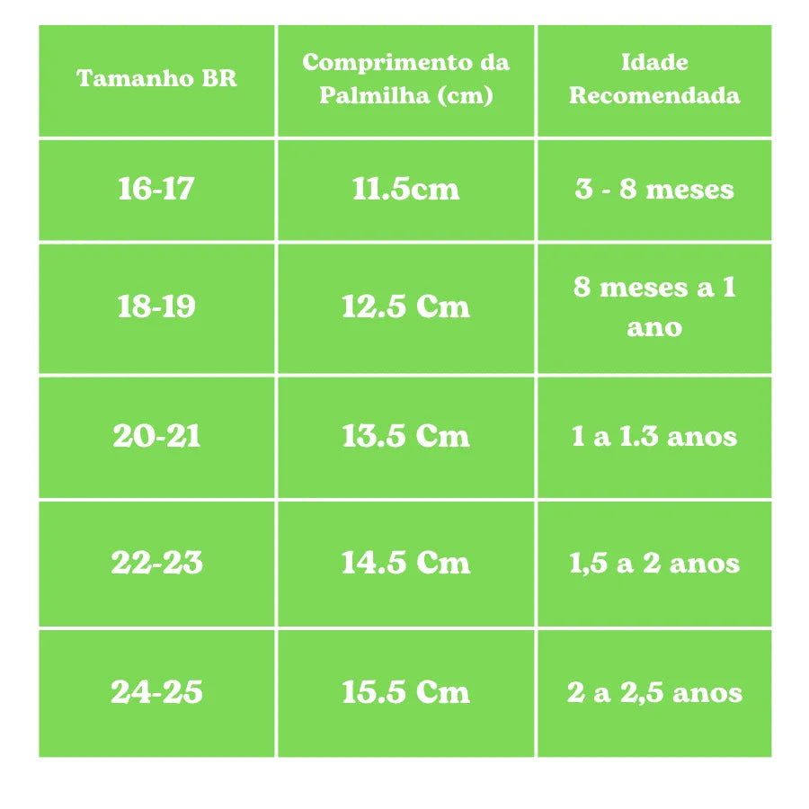 O tamanho padrão pode variar de acordo com a marca, por esse motivo, recomendamos que você faça a medição do pezinho do bebê conforme as instruções e compre de acordo com o tamanho da palmilha para evitar problemas de trocas e devoluções.