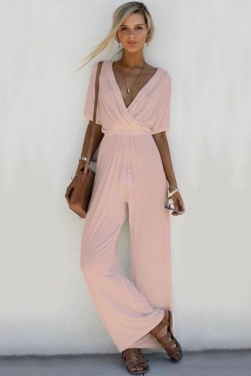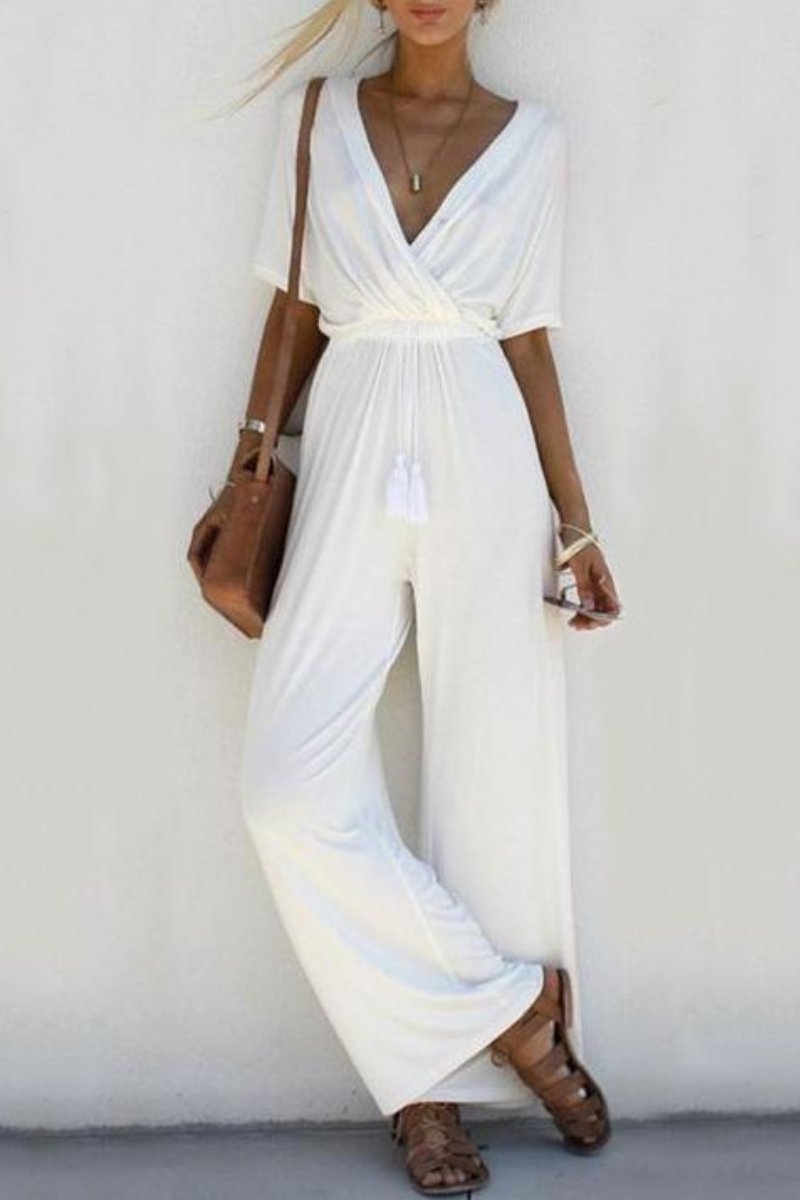 Renove o seu guarda-roupa de verão com este macacão com decote em V. A silhueta casual fará deste macacão a sua peça favorita para usar nas férias. Mangas curtas, calças largas e um cordão com franjas são os detalhes que fazem a diferença. É leve para que você possa colocá-lo na sua mala de mão para uma pequena viagem. Combine com as suas rasteirinhas para ficar confortável durante o dia todo ou crie um look elegante com o seu salto alto favorito.