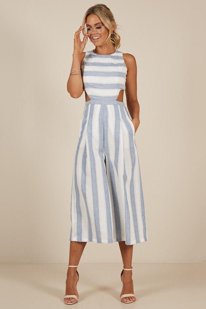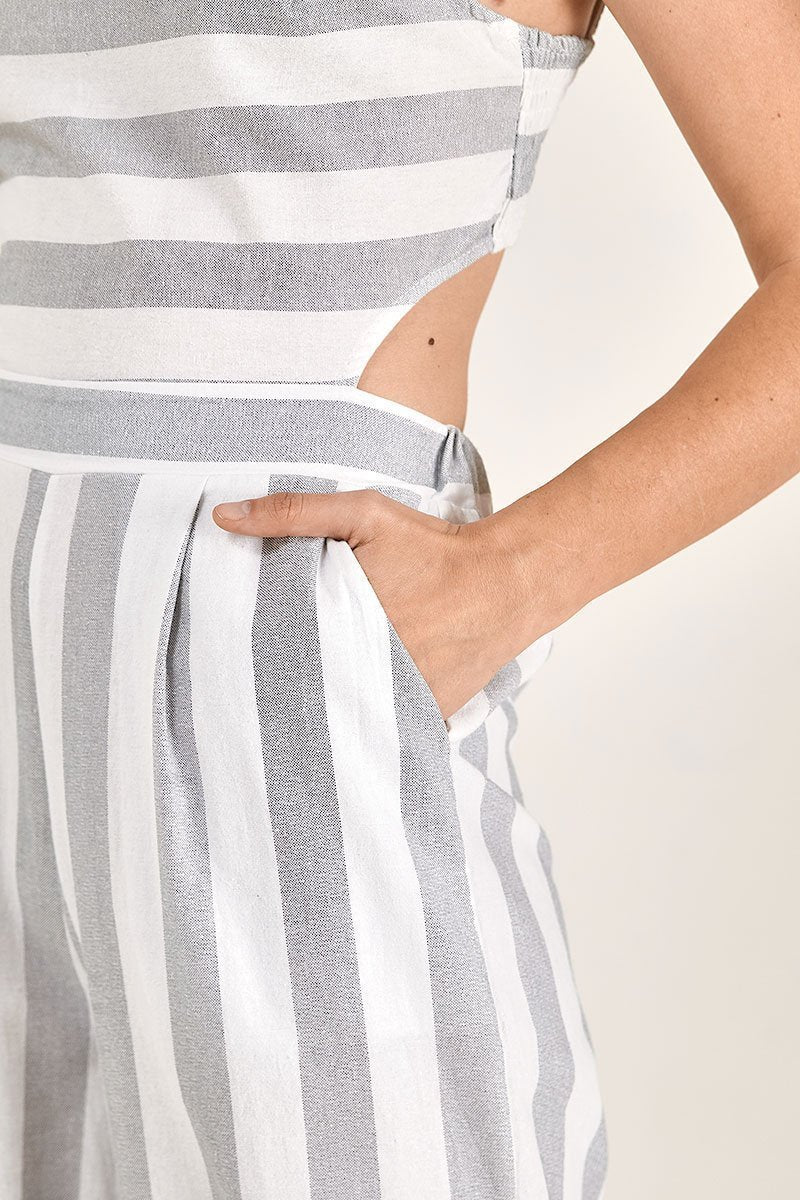 Apaixone-se por esse macacão versátil. A costa elástica com um zíper facilita na hora de vestir e tirar. O design recortado nas laterais e costas proporciona um toque descontraído. O material de algodão e as pernas largas manterão você fresca durante os dias quentes.