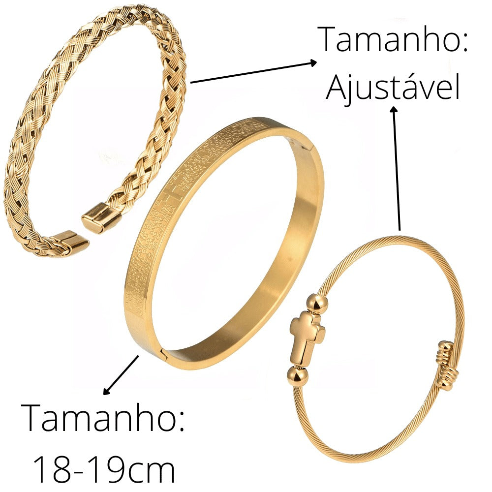 Conjunto 3 Pulseiras em Aço Inoxidável Banhada em Ouro e Prata Crucifixo PAI NOSSO