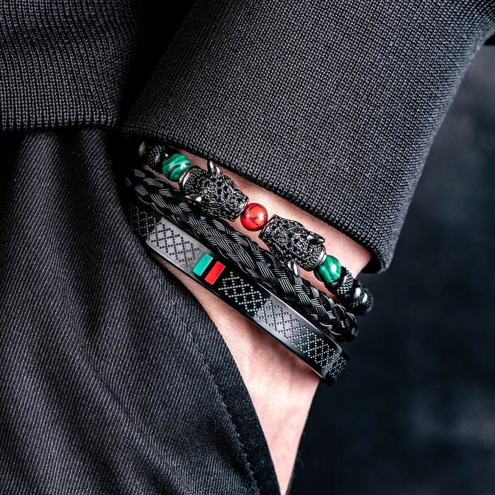 Revestida com metais nobres: **ouro**, **prata** e anodização premium (na versão preta), esta é a peça perfeita para realçar sua singularidade e exibir sua masculinidade com um toque de **luxo** e **refinamento**! Material de alta qualidade: Fabricada em aço inoxidável, a estrutura perfeita que combina beleza, resistência e durabilidade, garantindo que sua peça permaneça impecável ao longo dos anos. Acabamento refinado: Apresenta um polimento excepcional. Esse tipo de acabamento confere um toque extra de sofisticação à peça, resultando em uma superfície suave e brilhante.