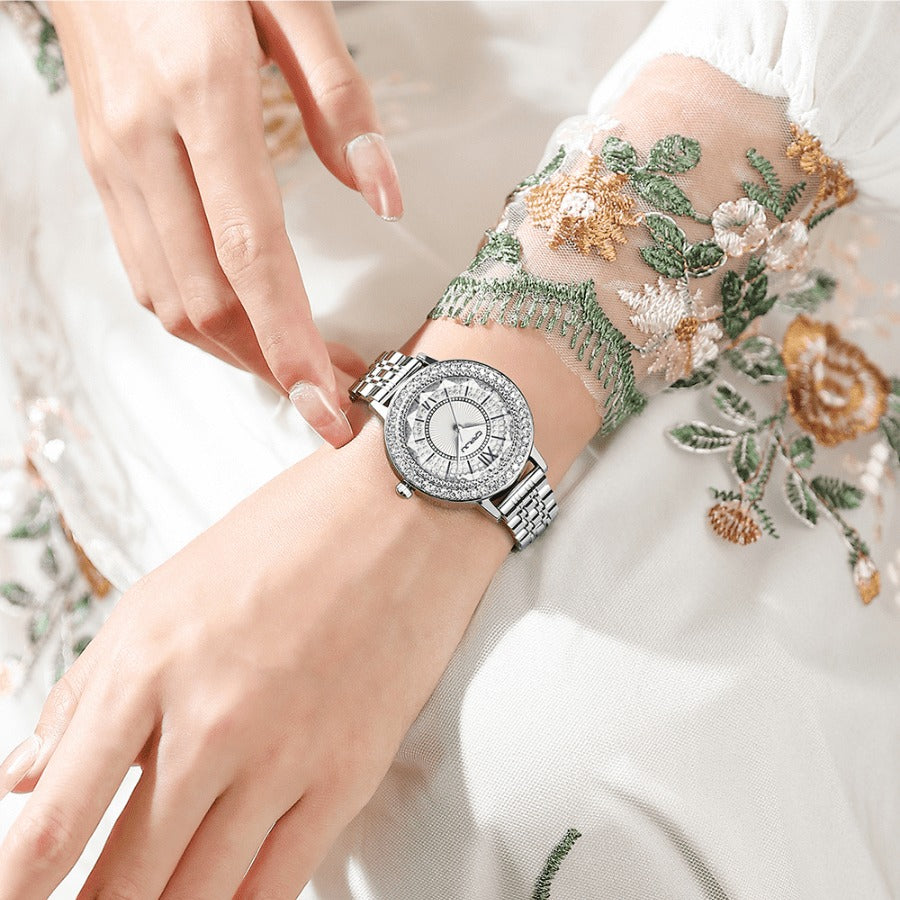 Relógio feminino; Acessório de moda; Relógio de pulso; Relógio de vestir; Cristal hardlex; Resistente a riscos; Cristais de zircônia; Pulseira em aço inoxidável; Pintura eletroestática; Ouro rosê; Prata; Design 3DD; Luxuoso; Tecnologia de qualidade; Resistência à água; 30m; Elegância; Exclusividade; Sofisticação; Precisão; Durabilidade.