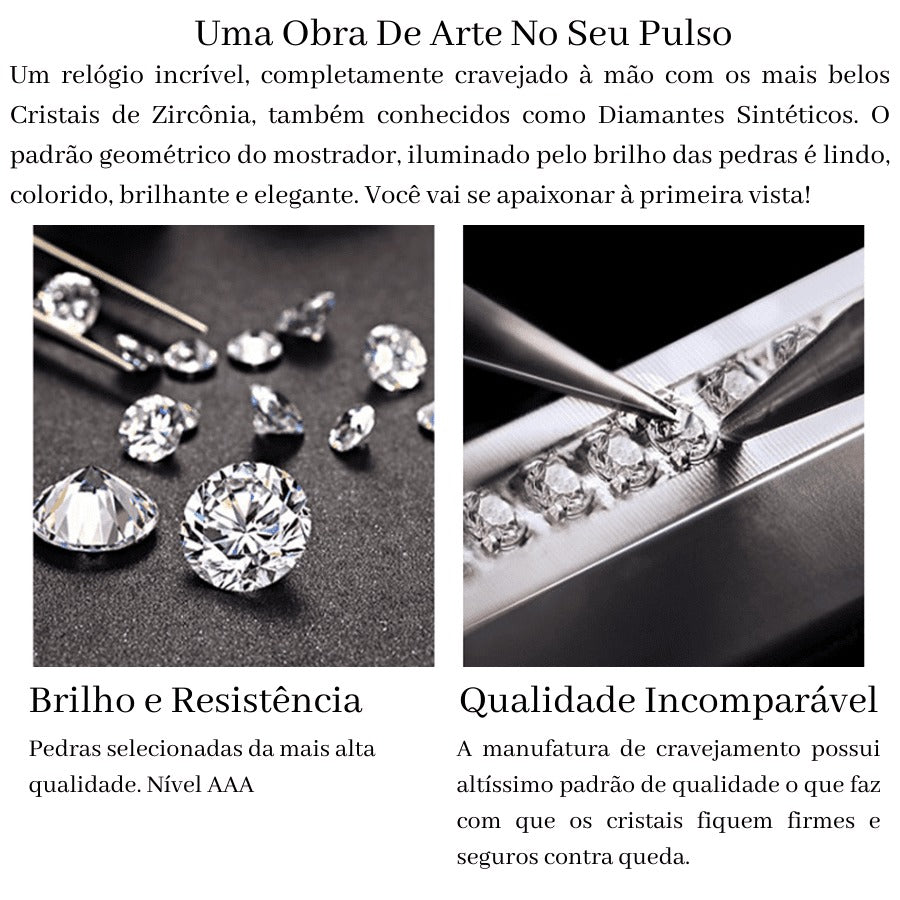 O mostrador deste relógio é um verdadeiro espetáculo! Com vidro de cristal Hardlex lapidado em efeito diamante 3D cobrindo um mostrador todo cravejado de cristais de zircônia da melhor qualidade. Cada cristal é colocado e fixado à mão, oferecendo excelência de qualidade e resistência, com o mais alto nível de sofisticação e beleza.