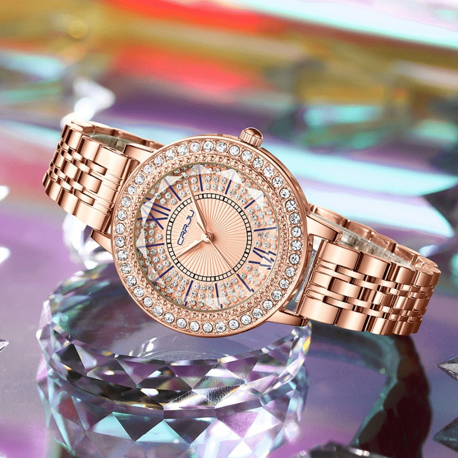 Relógio Feminino CRRJU CRISTAL DIAMOND - Vidro Lapidado, Cravejado Com Cristais de Zircônia, Movimento de Quartzo, Resistente à Água 30M