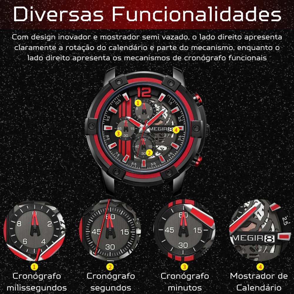 - 1x Relógio Masculino Multifuncional Cronógrafo com Pulseira em Silicone MEGIR CRONOGRAPH SPORT;