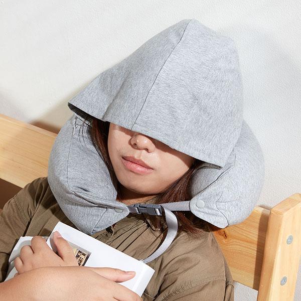 Indo em um longo vôo? Fique confortável no avião com este **travesseiro de viagem de pescoço com capuz**! O capuz bloqueia a luz e garante um sono de qualidade, enquanto a almofada macia suporta totalmente o seu pescoço, evitando stress e dores. Acorde completamente renovado e pronto para umas férias divertidas!
